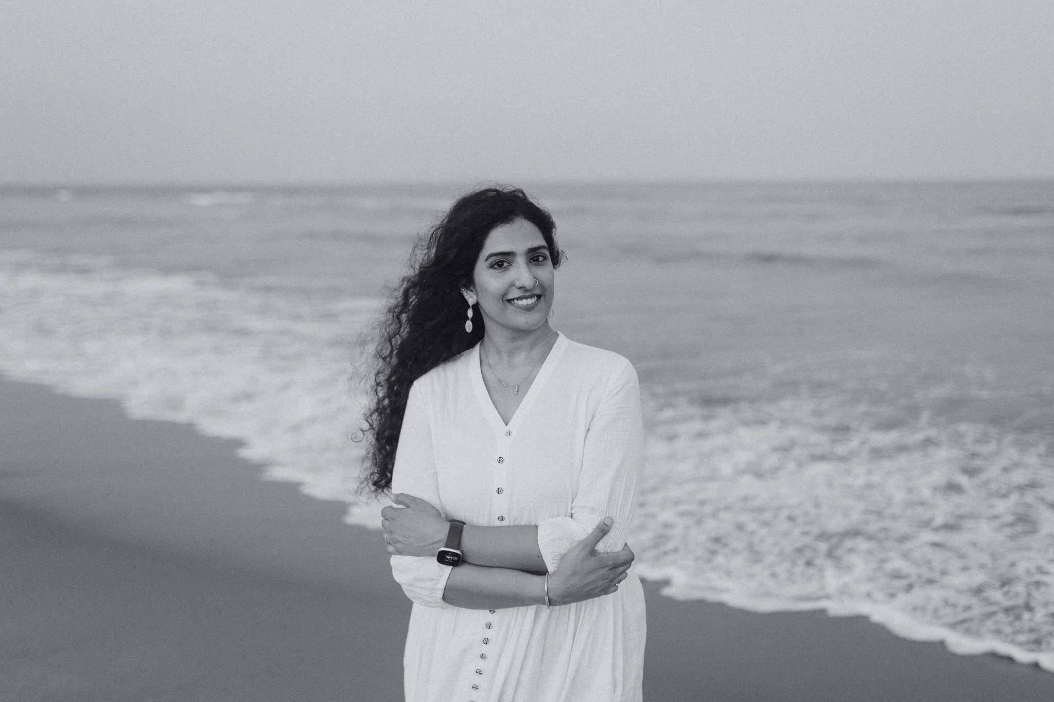 The setting was perfect for a beach portrait session in Chennai. The sea breeze, soft evening light, and quiet shoreline created a beautiful atmosphere. At one point, Vaishali sat by the shore, facing the ocean, and began singing Netru Avan Irundhaan. The moment felt cinematic, so I quickly recorded a short video for social media. I asked her to hold onto that melancholic mood—but she couldn’t stop laughing. Out of six clips, five were filled with her laughter. And honestly, nothing makes me happier than seeing her smile so freely.